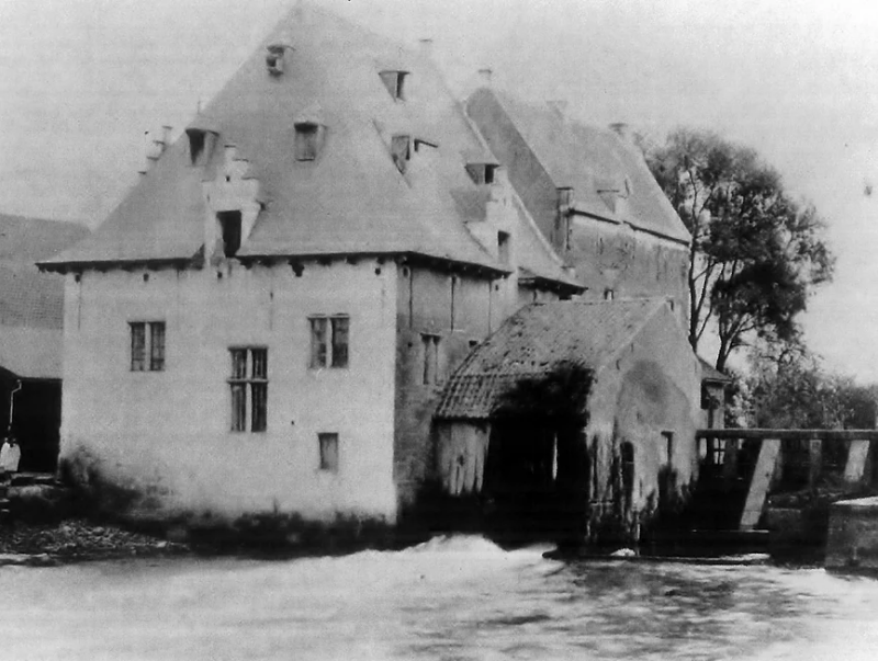 De foto dateert van voor 1902, maar geeft goed de 17e eeuwse molen en het woonhuis weer. De beide houten waterwielen worden beschermd tegen het zonlicht door een overkapping.